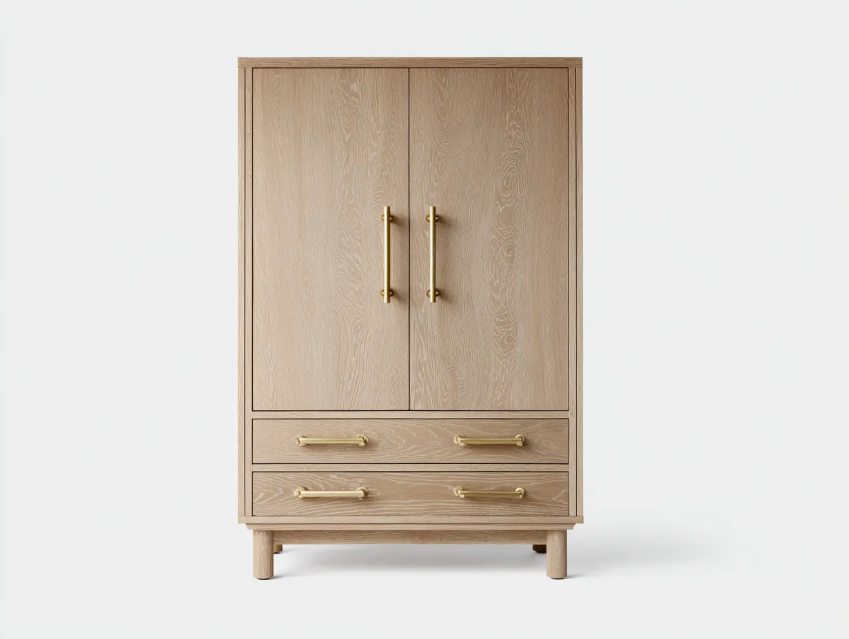 Constructed from engineered wood with a natural wood grain surface, complemented by gold-tone metal handles. The finish is smooth and easy to maintain, and the structure is designed for stable and consistent indoor use.